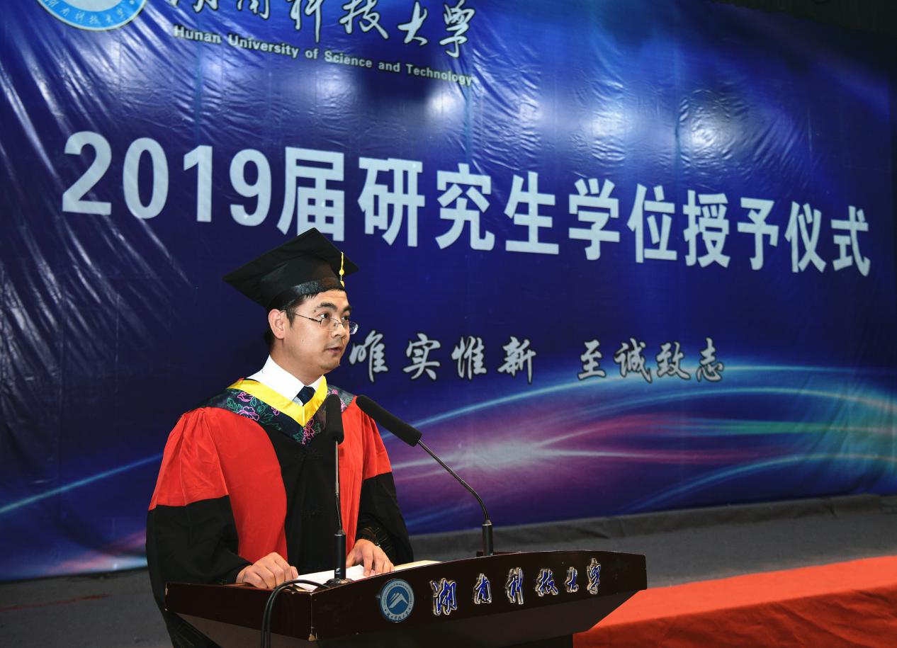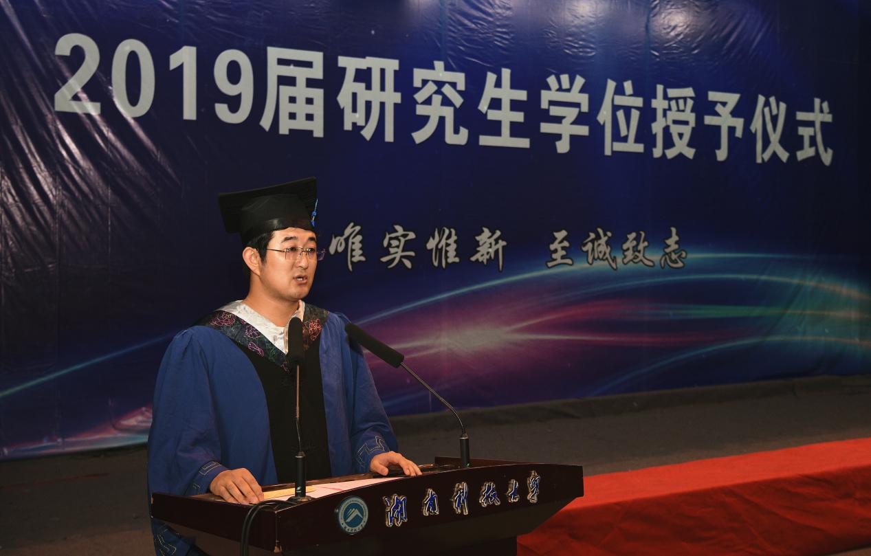 毕业生代表、化学化工学院化学专业硕士毕业生王宏回忆了他的心路历程:三年来,秉承“唯实惟新,至诚致志”的科大校训,努力进取,追求卓越。扎根学术殿堂,坚信成功只属于奋斗者。并对母校和老师的培养,表达了真诚的感谢,他表示“将牢记恩师的嘱托、同学的祝愿,将读书时光苦练的精华踏入人生的每个里程。”