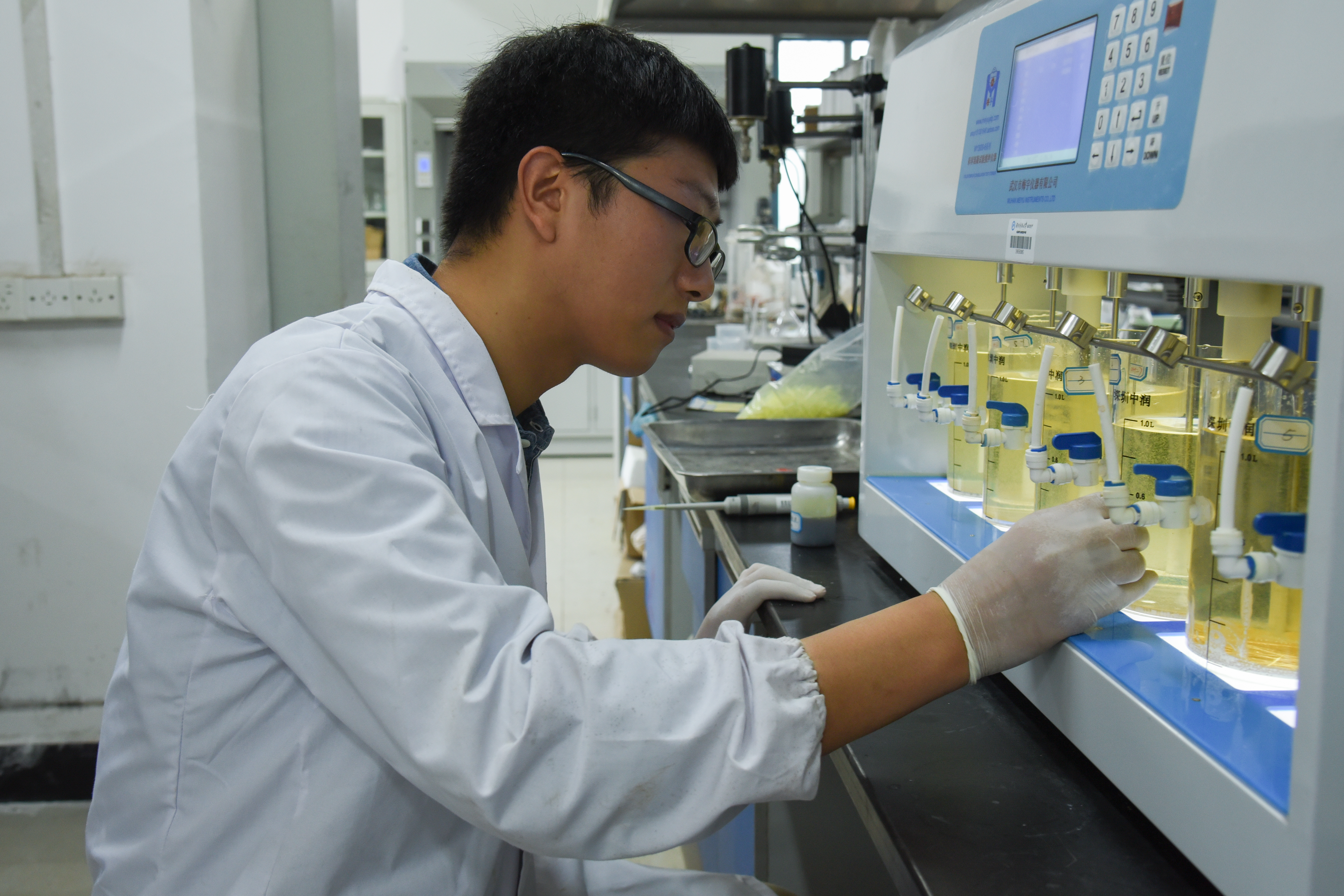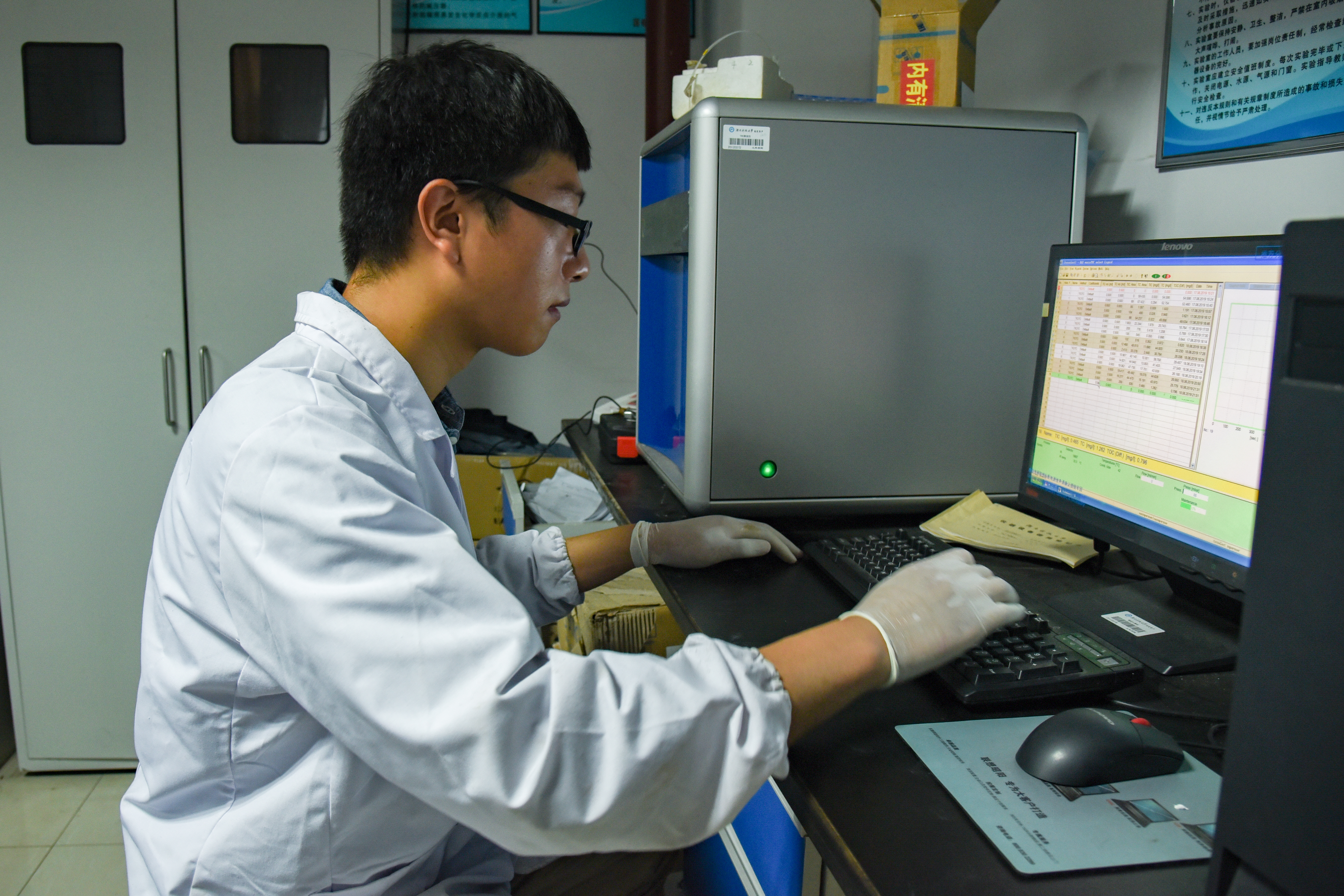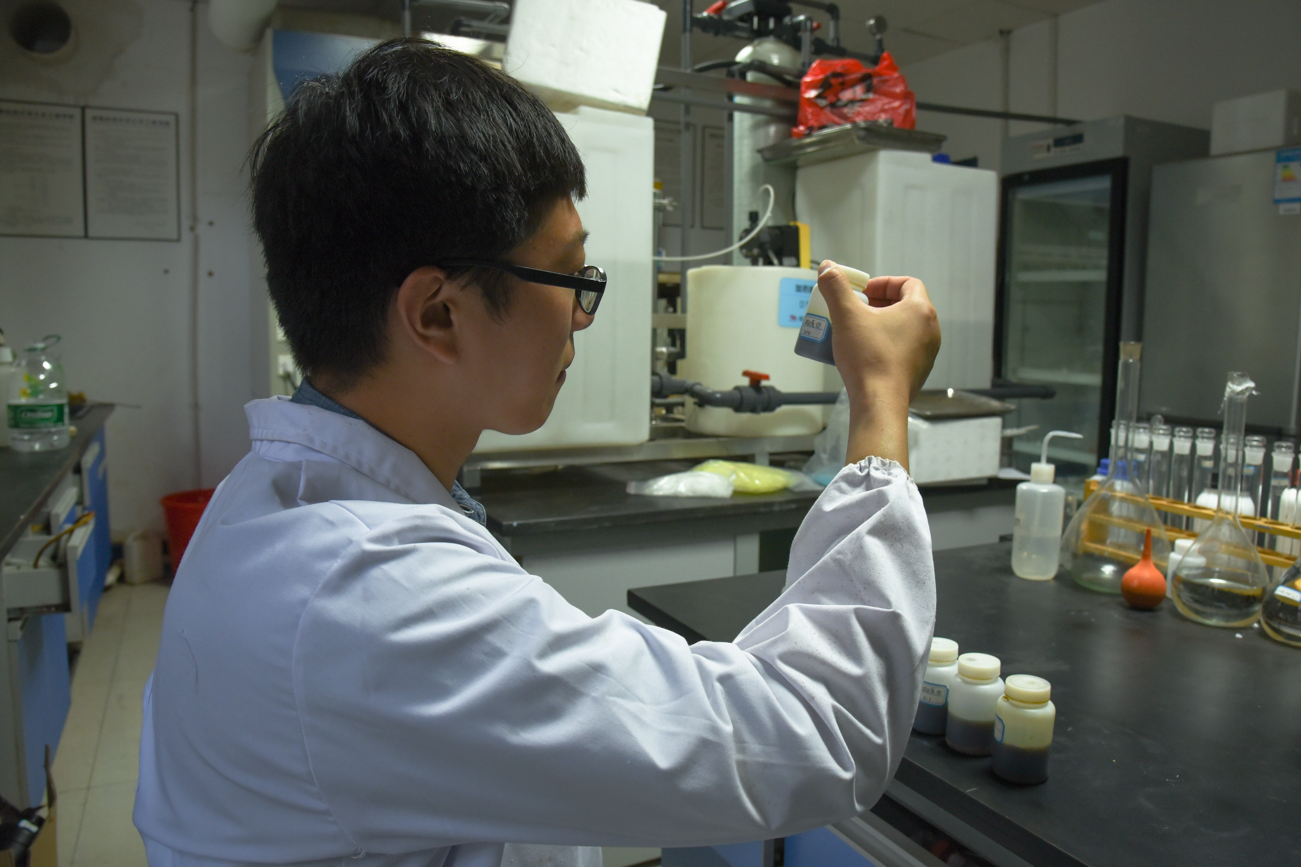 水处理生化室里,卞永宁戴着眼镜,着一身白大褂,手里正握着瓶混凝剂,认真做着实验。