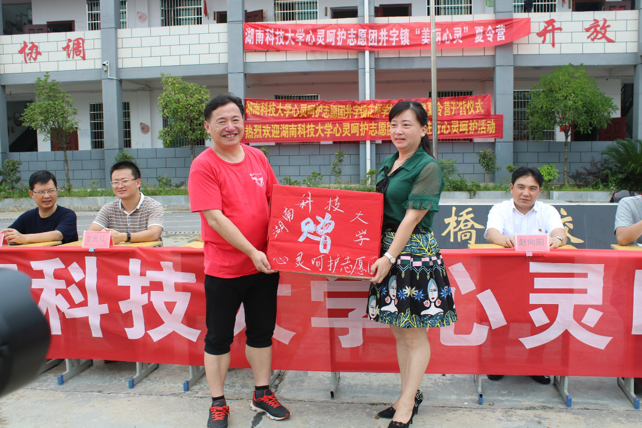 午饭后,举办了井字镇花桥学校美丽心灵夏令营开营仪式。仪式由井字镇党委委员向卫煌同志主持,井字镇党委书记赵向阳同志代表井字镇党委和政府致欢迎词,花桥学校校长陈丽同志,花桥学校代表老师彭国庆老师都发表了热情洋溢的讲话,对关爱留守儿童美丽心灵的夏令营活动表达了美好的期待。陈姝颐同学作为志愿者代表发言,王伟清教授介绍了志愿团的基本情况后,表示一定秉承真挚的志愿精神、务实的工作作风,努力追求良好的工作实效,把这次夏令营开办成功。会上,王伟清教授代表志愿团向参加夏令营的孩子们捐赠了一批文具,并当即发放到每一位孩子手中,接到礼物的孩子们都露出了灿烂的笑容。