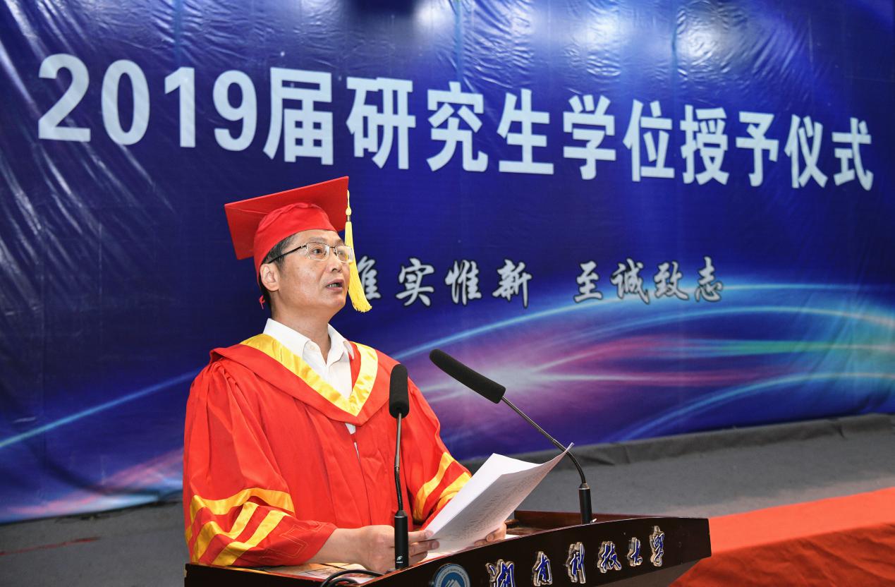 校长李伯超代表学校向圆满完成学业的全体研究生表示热烈的祝贺。他认为,科大学子应怀有一颗火热的赤子之心。人生的旅程漫长艰辛,任凭岁月变迁、人生起伏,我们要对祖国、对人民、对母校怀有赤子之心,深厚的赤子之心是人生最强大,最持久的力量源泉。我们要自觉将自己的命运与祖国的命运紧紧联系,始终与人民站在一起,以人民之忧为忧,以人民之乐为乐。希望科大学子在历经沧桑后,仍然怀有赤子之心,无论身在何方,飞得多高,走的多远,母校都是最坚强的后盾,最温暖的家园。